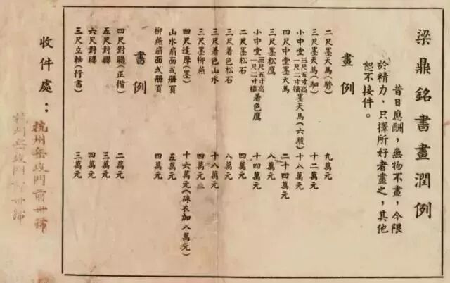 中堂,七尺者三十元,每减一尺减二元,每加一尺加二元。楹联,四尺者十二元,每加一尺加二元……并附有说明:但书下款,若书上款者加倍计。来文及金笺均加倍,色笺加半,限字限行,当照杂体例以字计。单宣劣纸不书。寿屏寿文,不撰不书。墨浓淡或墨渍不再写。纸破不赔。磨墨费加一。