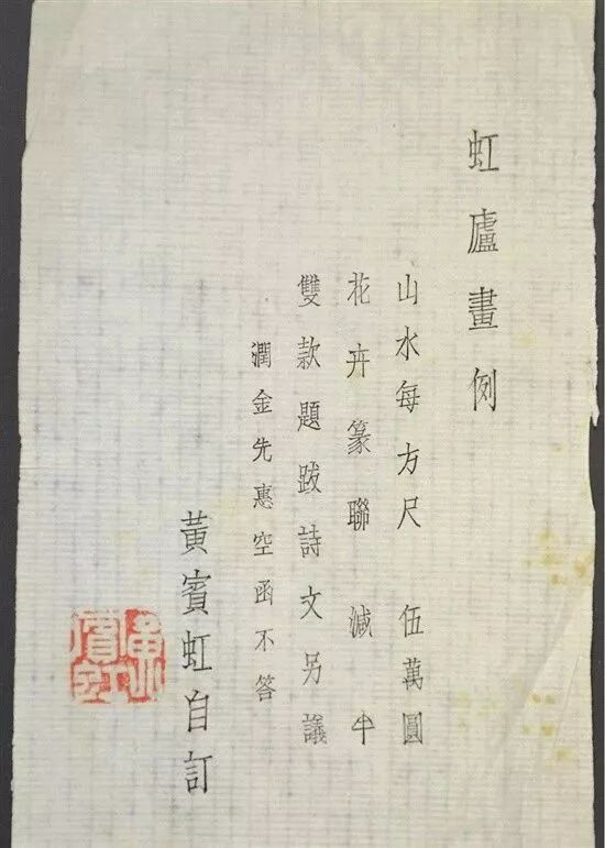黄宾虹自订润例:“山水每方尺五万元,花卉篆联减半,双款题跋诗文另议,润金先惠空函不答。”