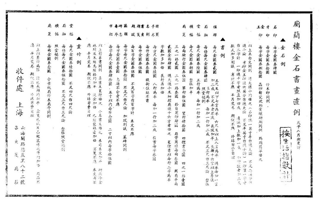 堂匾廿两,斋匾八两,楹联三尺三两、四尺四两、五尺五两、六尺八两,横直整张四尺八两、五尺十二两、六尺十六两,书画一例,条幅视整张减半,琴条四两,书画一例,册页执摺扇每件二两,一为度,宽则递加,上记:每两依大洋一元四角。