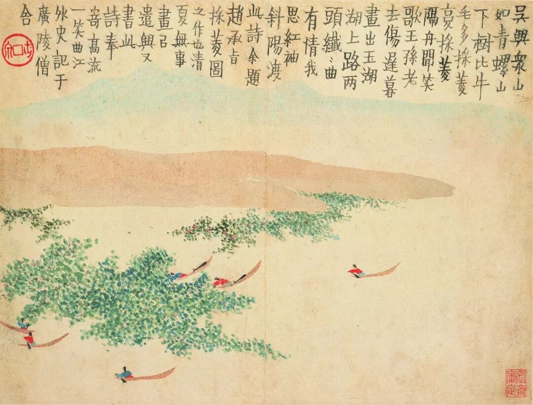 此诗余题赵承旨《采菱图》之作也。清夏无事,画以遣兴,又书此诗,奉寄高流一笑。曲江外史记于广陵僧舍。