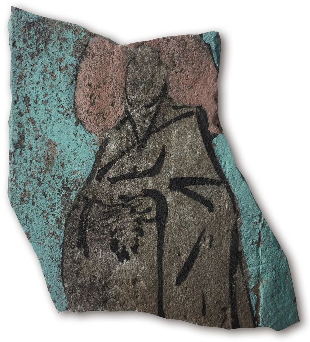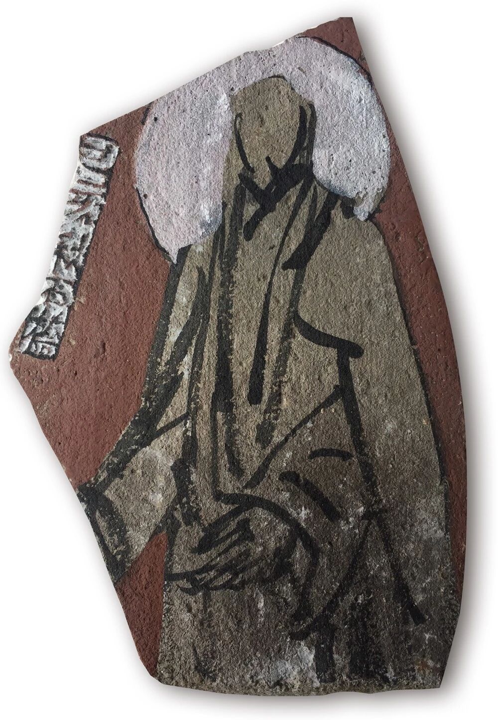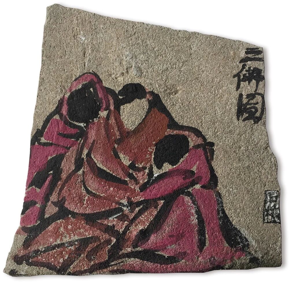 石桥的“我佛”见于残瓦上,徐徐淡淡,寥寥数笔,气韵生动。他不囿于成法,常常直抒胸臆,将对象提炼为一个符号,写意为之,迁想妙得。远而望之,神形兼备,就而察之,则化为抽象面目。大写佛像,不减恭敬之心,相反,这样的表达方式将石桥展开得更详细,也将石桥学佛的证悟表露无遗。