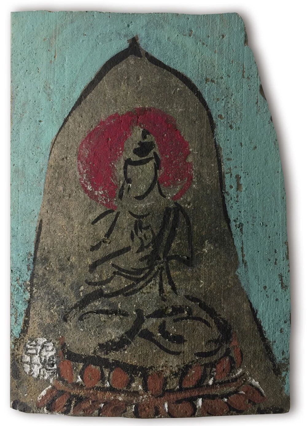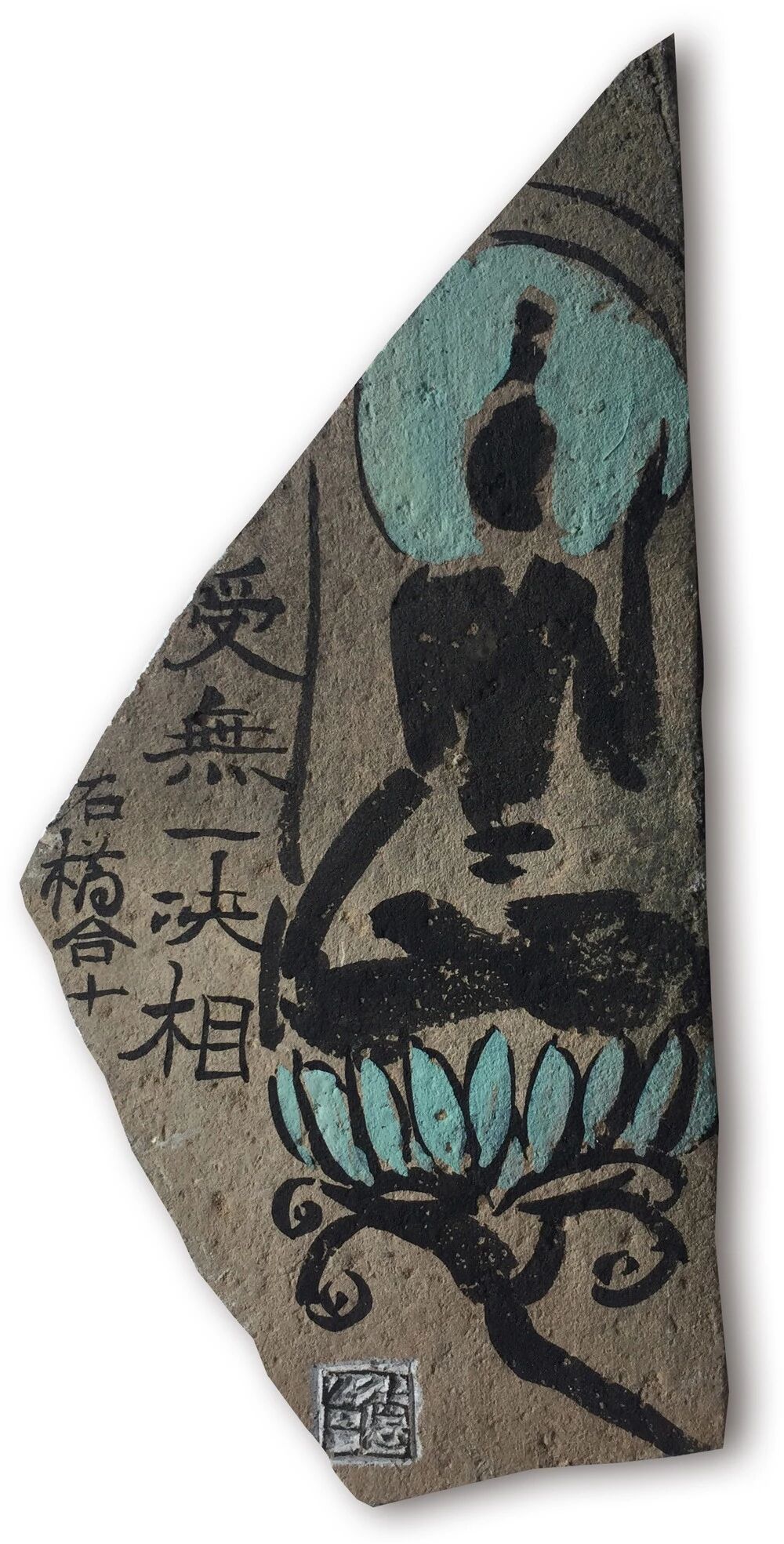 “残瓦我佛”系列得之容与,禅境不独残瓦佛像,同时牵连了落款盖章与特殊装裱,静与境如月印万川,处处有朗。