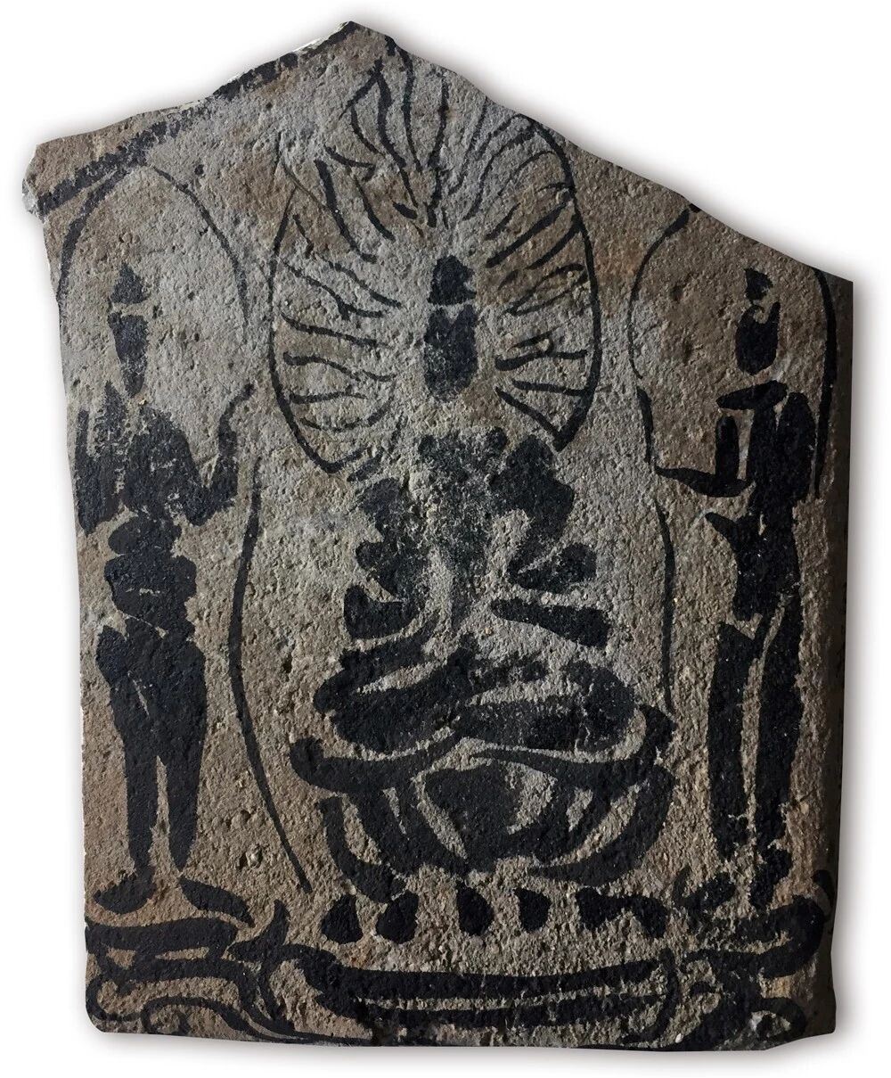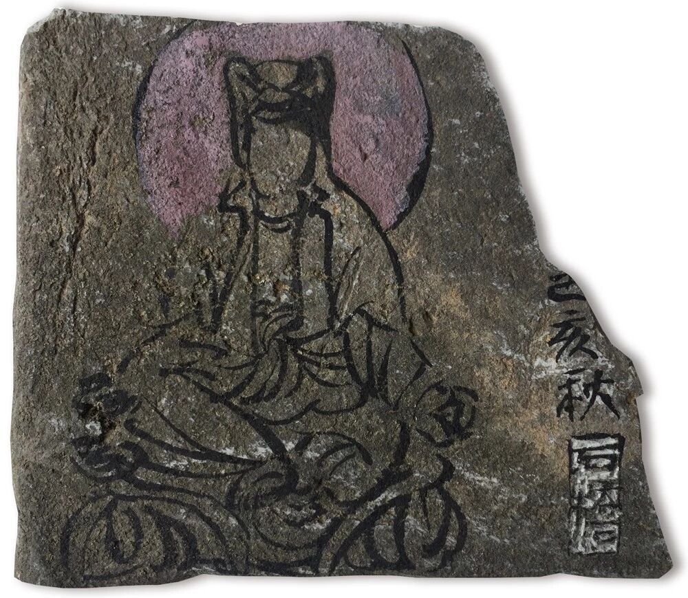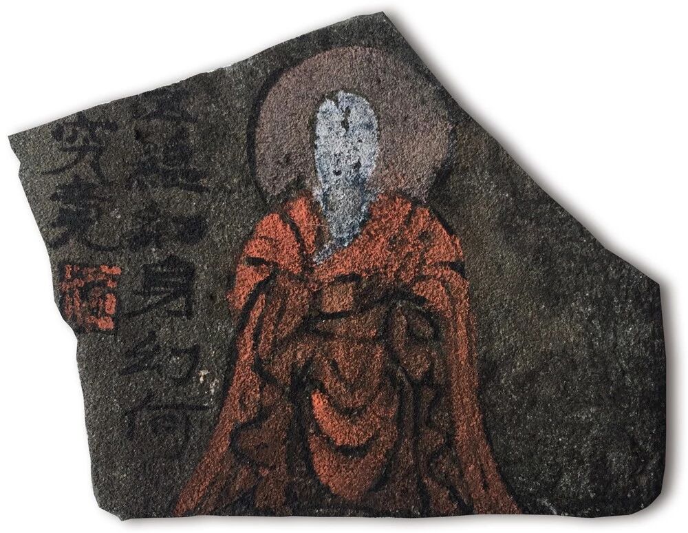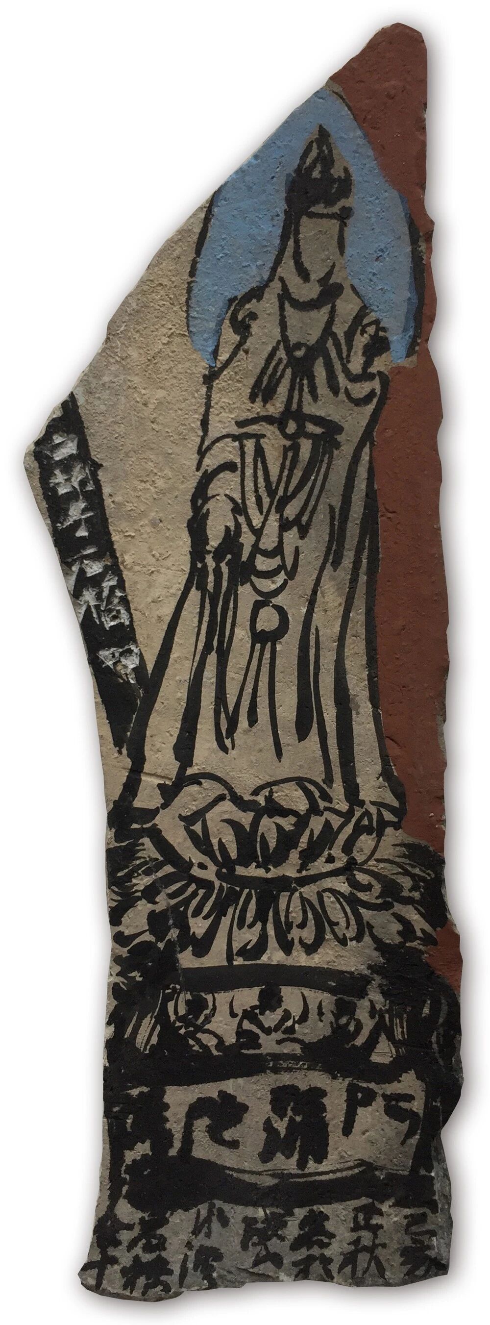 在残瓦上写佛,则要溯至老屋修葺。他的瓜山小屋落在山间,覆以百年旧瓦。年久漏水,及至翻修,褪下几多残瓦。石桥心生妙意,请瓦进屋,笔墨为礼,幸甚至哉。