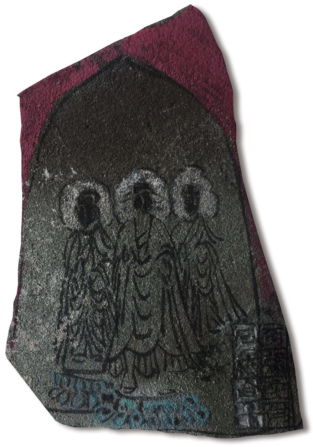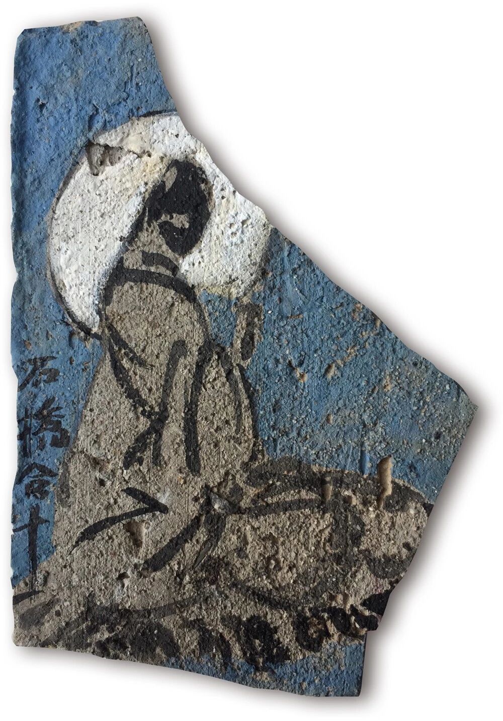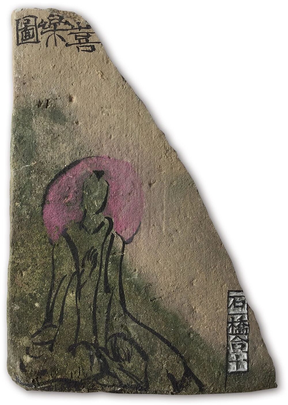 在残瓦上写佛,则要溯至老屋修葺。他的瓜山小屋落在山间,覆以百年旧瓦。年久漏水,及至翻修,褪下几多残瓦。石桥心生妙意,请瓦进屋,笔墨为礼,幸甚至哉。