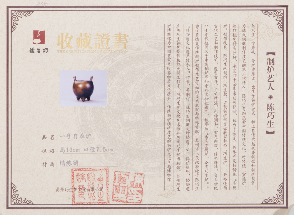 ●陈巧生,1957年生于江苏,字彦岐,号炉香居士,出生于铜炉世家,祖上自清代起从事铜器和铜炉制作,为陈氏铜器制作技艺第三代传人。陈巧生自幼热爱中国传统文化,对传统“宣德炉”制作技艺情有独钟,承艺四十余年来刻苦钻研,致力于恢复、传承并发扬传统“宣德炉”制作技艺。由于在恢复传统铜炉制作技艺方面的突出成就与特殊贡献,苏州市人民政府授予陈巧生“苏州市级非物质文化遗产项目(苏州仿古铜器制作技艺)代表性传承人”称号,并制订“陈巧生铜器失蜡铸造工艺”保护规划。
