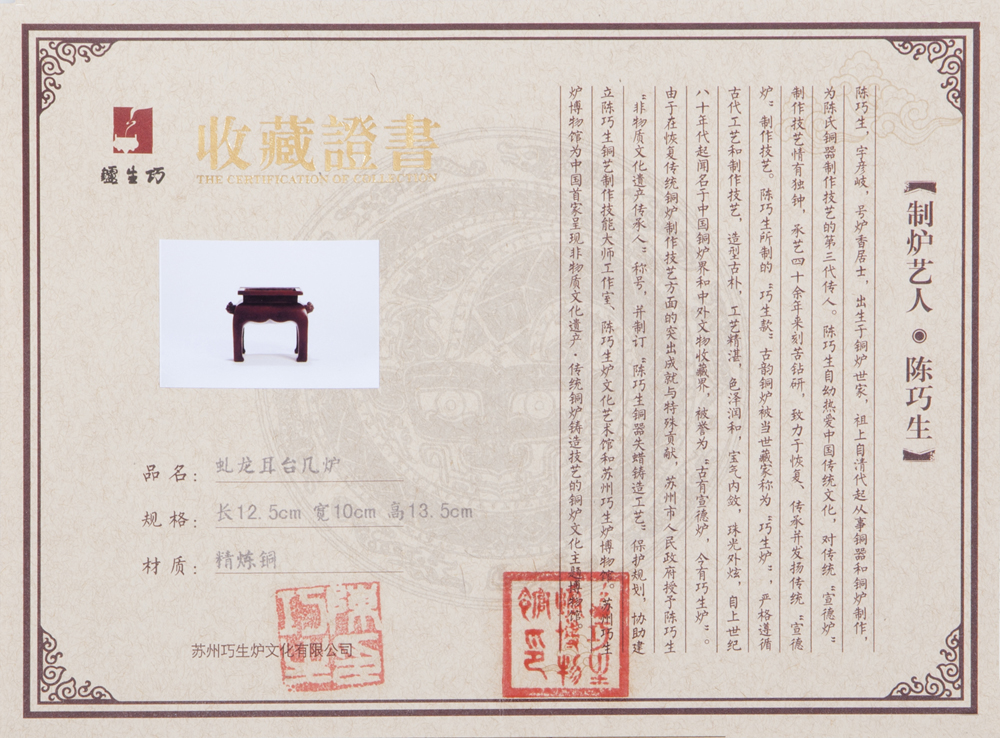 ●陈巧生,1957年生于江苏,字彦岐,号炉香居士,出生于铜炉世家,祖上自清代起从事铜器和铜炉制作,为陈氏铜器制作技艺第三代传人。陈巧生自幼热爱中国传统文化,对传统“宣德炉”制作技艺情有独钟,承艺四十余年来刻苦钻研,致力于恢复、传承并发扬传统“宣德炉”制作技艺。由于在恢复传统铜炉制作技艺方面的突出成就与特殊贡献,苏州市人民政府授予陈巧生“苏州市级非物质文化遗产项目(苏州仿古铜器制作技艺)代表性传承人”称号,并制订“陈巧生铜器失蜡铸造工艺”保护规划。